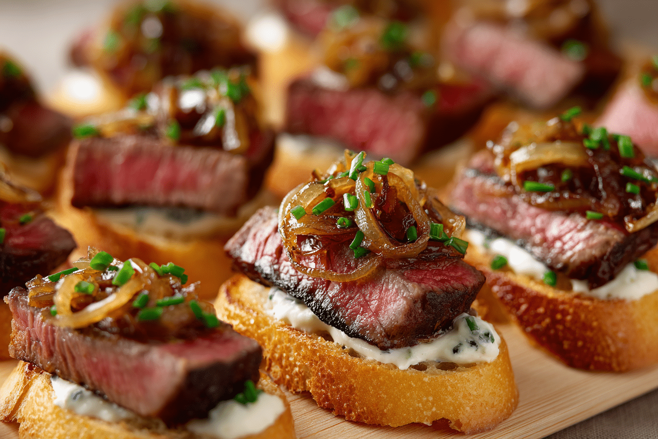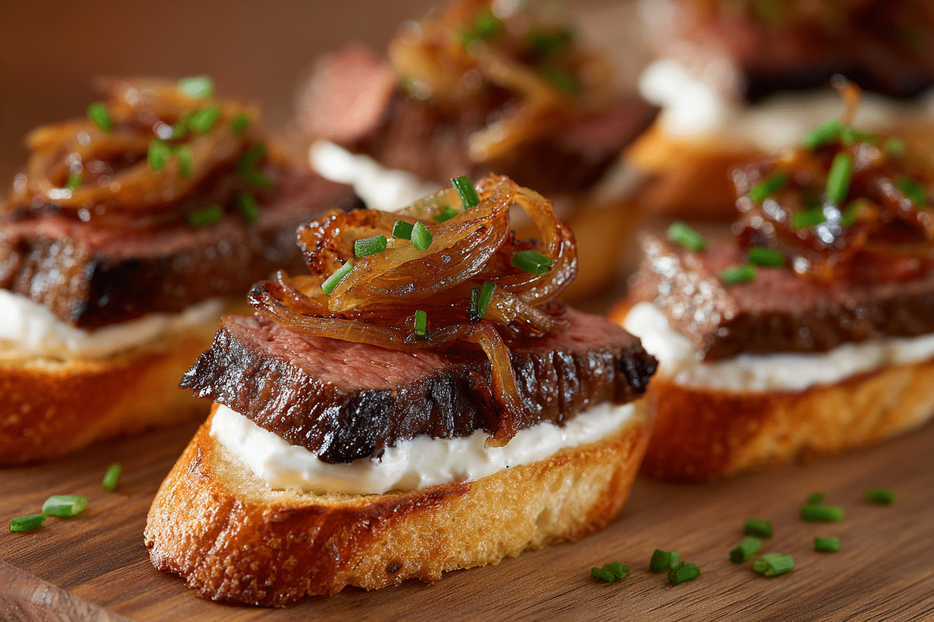 Steak Crostini with Horseradish Sauce & Caramelized Onions is the ultimate elegant appetizer. Crispy toasted baguette slices are topped with tender steak, sweet slow-cooked onions, and a creamy horseradish sauce that adds the perfect kick.
