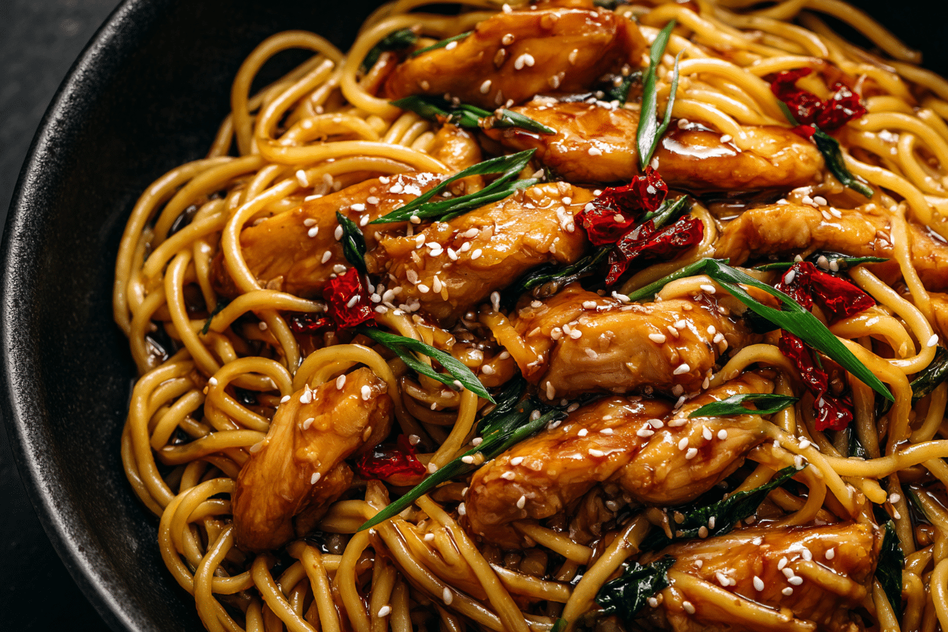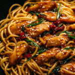 Inspired by the flavors of Chinese street food and pan-Asian stir-fries, this dish is a favorite for both busy weeknights and indulgent comfort food cravings. The chicken is seared until golden and sticky, then tossed with noodles and a glossy garlic soy sauce that clings to every strand.