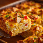 A filling and flavorful breakfast casserole with layers of hash browns, seasoned chicken, fluffy eggs, and two types of cheese. Great for brunch or meal prep.