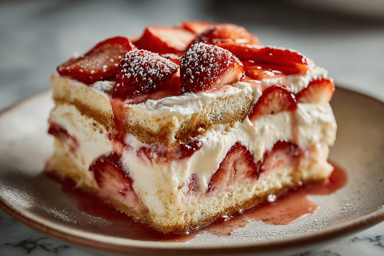 This Strawberry Tiramisu is a fresh twist on the classic Italian dessert, replacing coffee with sweet strawberry puree. Layers of ladyfingers, creamy mascarpone, and fresh strawberries make it light, elegant, and perfect for any occasion.