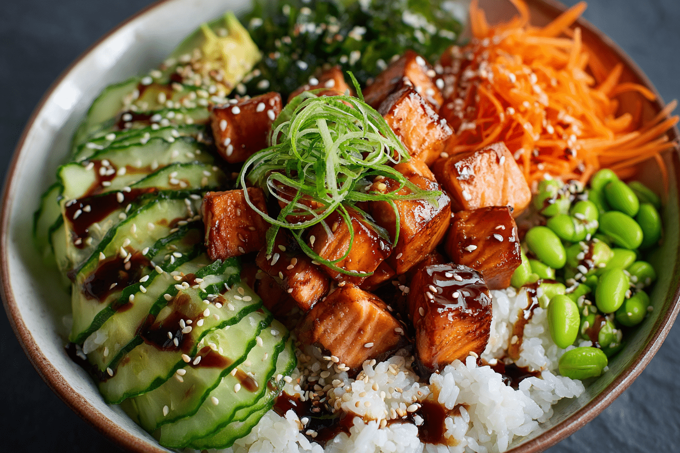 Teriyaki Salmon Sushi Bowl brings together tender glazed salmon, seasoned rice, crisp vegetables, and creamy avocado in a vibrant, satisfying meal. Inspired by traditional sushi flavors, this bowl delivers balance without the need for rolling or special equipment.