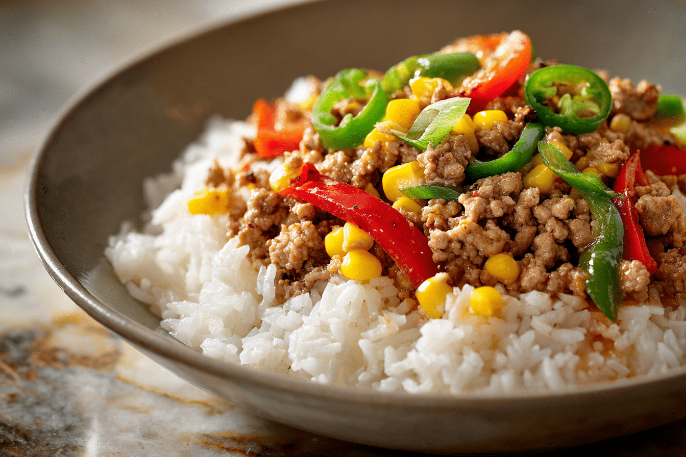 A hearty turkey combo rice bowl made with seasoned ground turkey, fluffy rice, and colorful vegetables for a simple and satisfying meal.