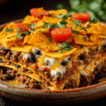 With seasoned ground beef, creamy refried beans, sweet corn, and melted cheese layered over crushed nacho cheese Doritos, this dish is everything you love about tacos baked into one pan. The vibrant mix of textures – from crisp chips and bubbly cheese to tender beef – is what makes this dish so satisfying. It’s fast, fuss-free, and full of flavor, perfect for feeding a hungry family or impressing guests at potlucks.