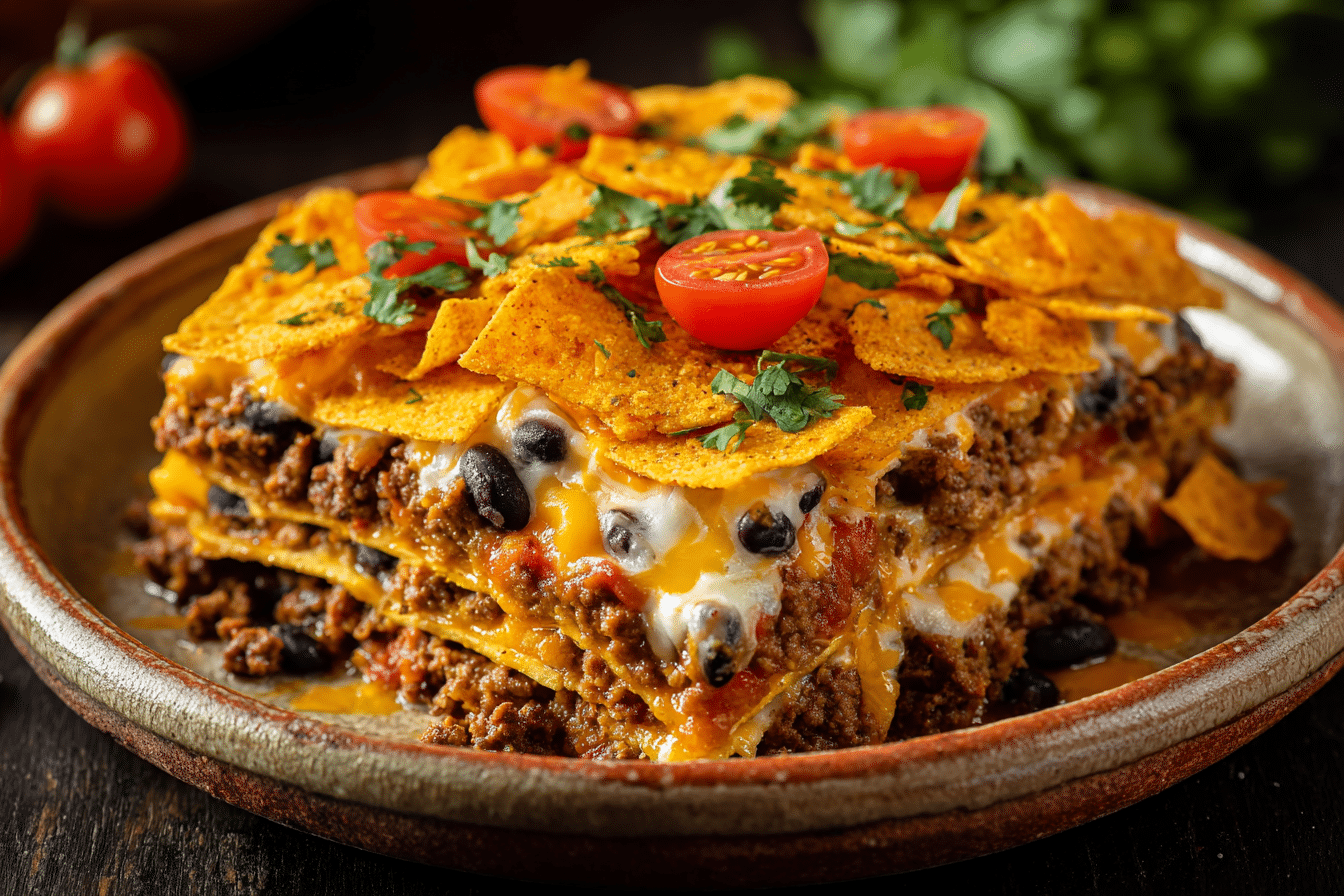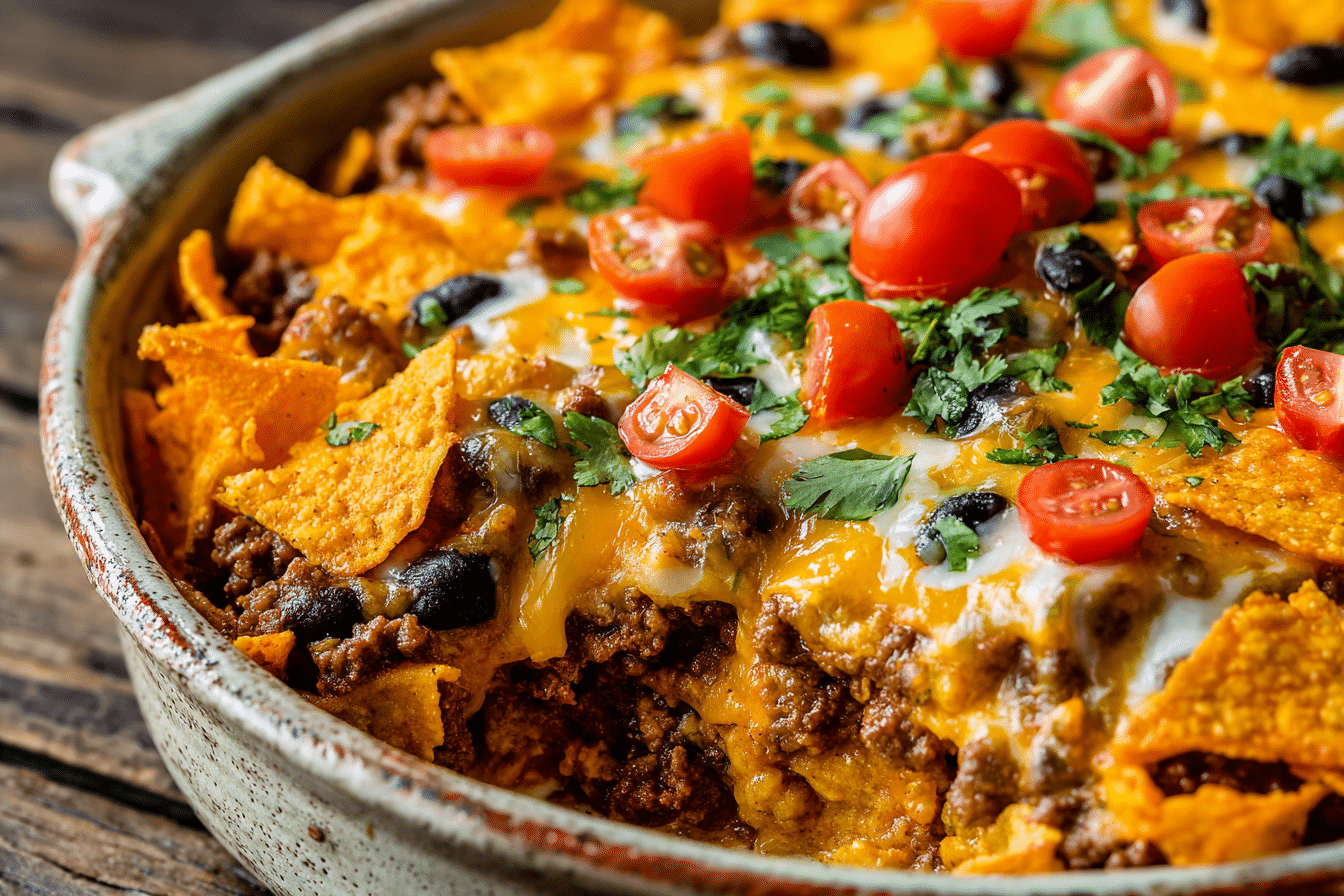 A cheesy, beefy, crunchy casserole inspired by the classic walking taco, layered with seasoned ground beef, refried beans, sour cream, cheese, and nacho cheese Doritos. Perfect for family dinners or parties.