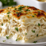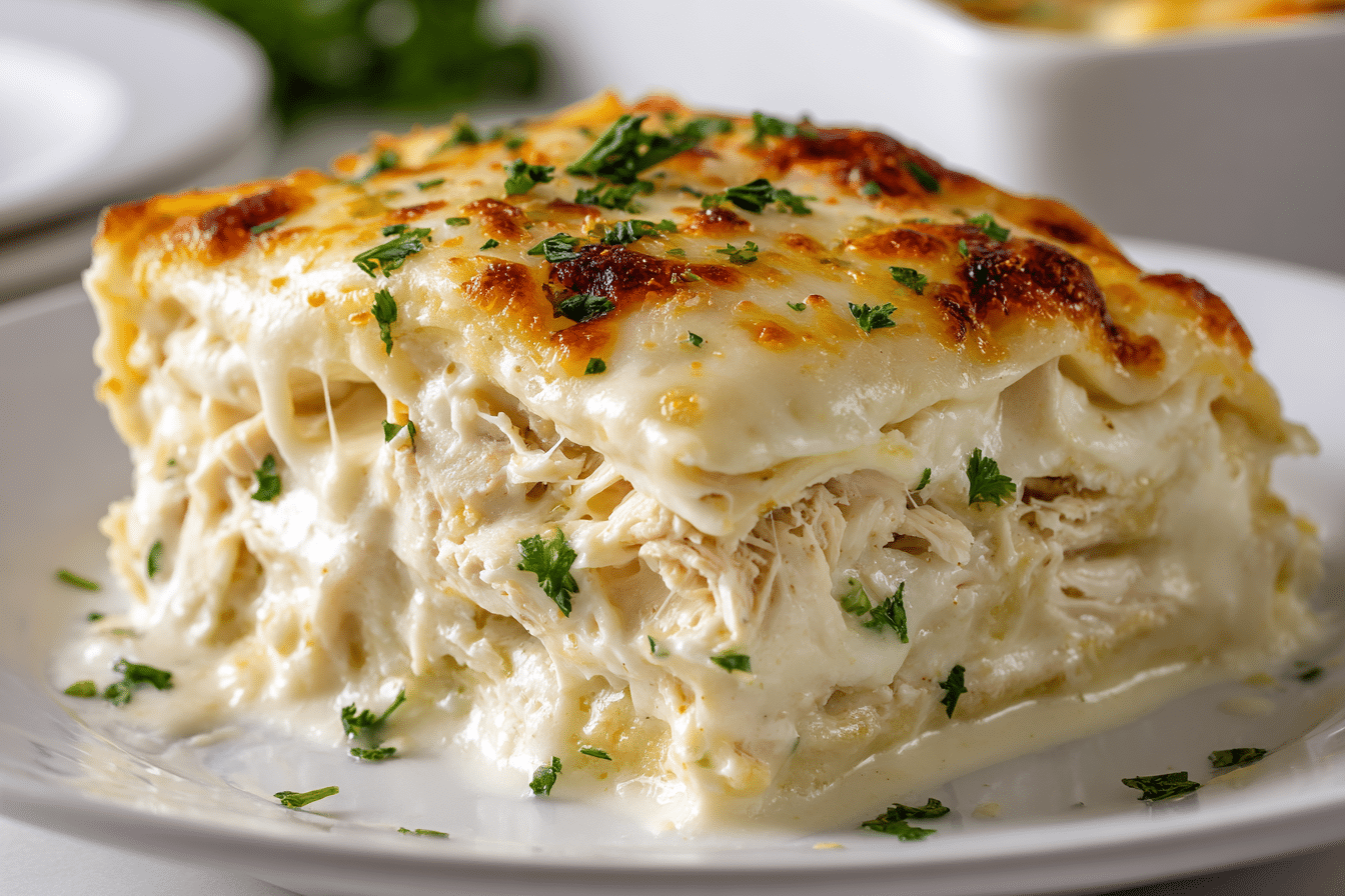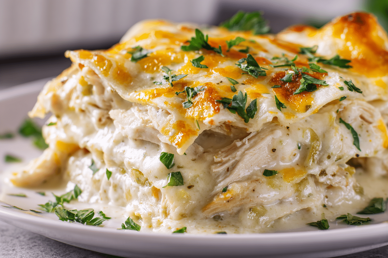 A creamy white chicken enchilada casserole layered with tortillas, shredded chicken, cheese, and a tangy sour cream and green chile sauce. Comforting and easy — a family favorite.